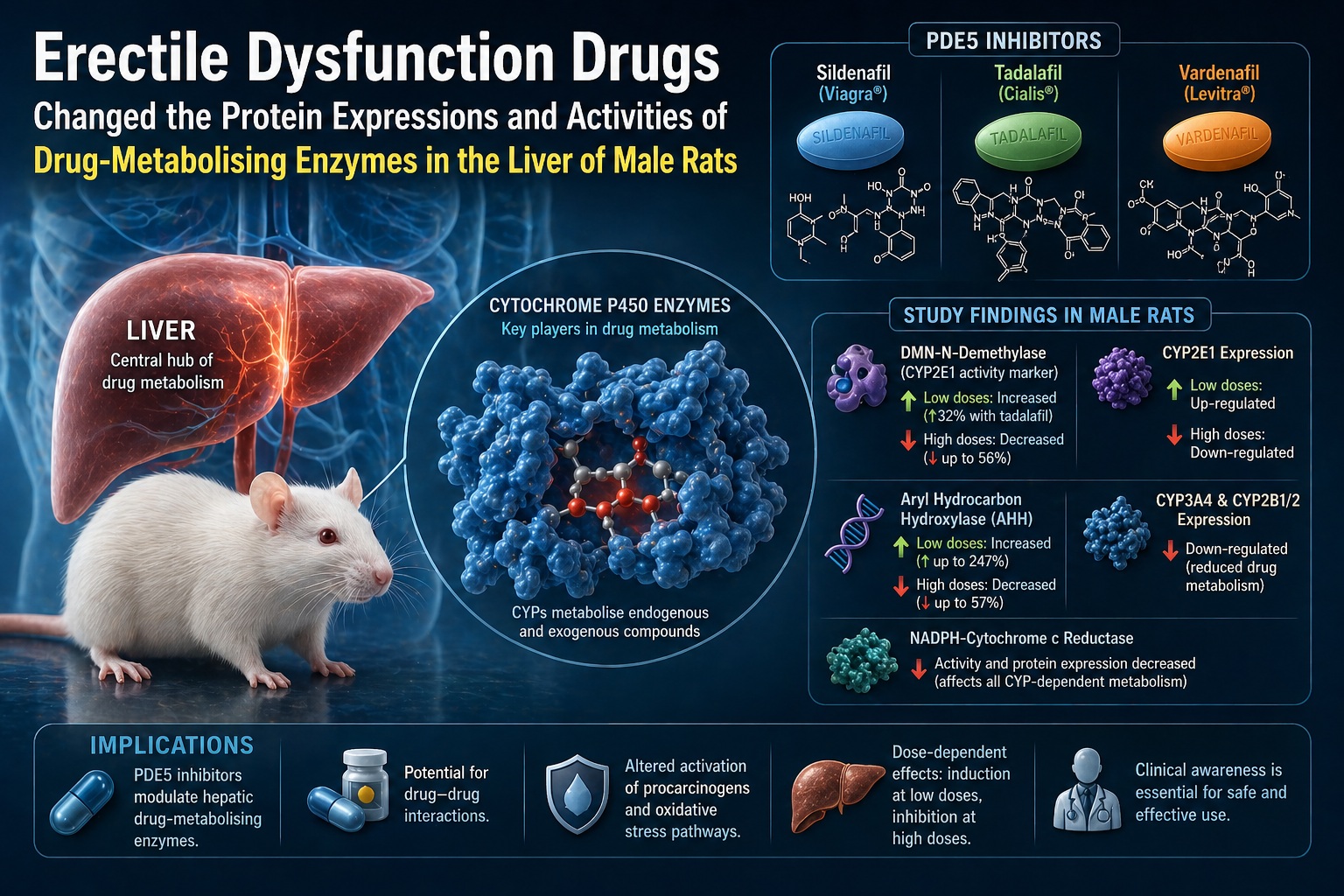 The study offers an important shift in perspective. It examines how erectile dysfunction drugs alter hepatic enzyme systems, specifically cytochrome P450 (CYP) enzymes and related metabolic pathways in male rats. What emerges is not merely a pharmacokinetic curiosity, but a deeper understanding of how these widely used agents may influence drug metabolism, toxicity, and systemic physiology.