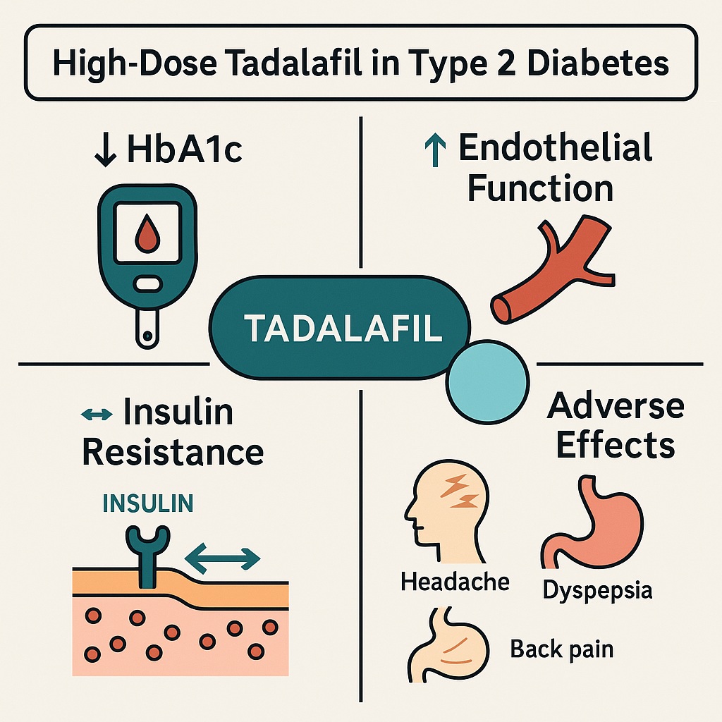 If confirmed, tadalafil and other PDE5 inhibitors may find a role not as first-line glucose-lowering agents but as adjunctive therapies targeting vascular and hepatic dysfunction in T2D.