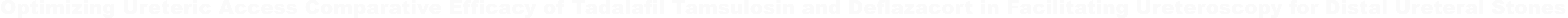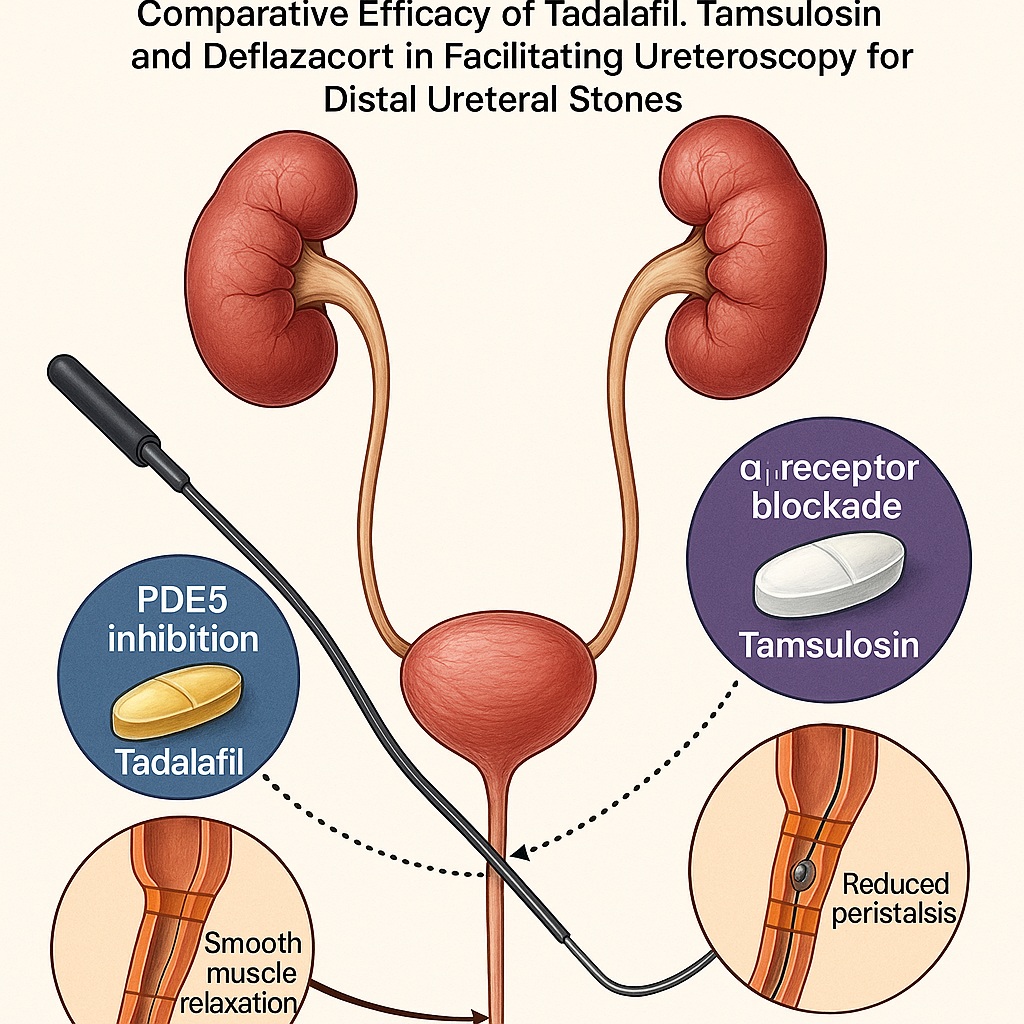 The pharmacologic approach aims to exploit alpha-adrenergic blockade and nitric oxide–mediated smooth muscle relaxation to reduce ureteral tone. Drugs such as tamsulosin, an α1-receptor antagonist, and tadalafil, a phosphodiesterase-5 (PDE5) inhibitor, have demonstrated potential for easing stone passage in medical expulsive therapy. Their possible use in pre-procedural ureteral dilation represents a logical extension of this mechanism. Moreover, deflazacort, a glucocorticoid with potent anti-inflammatory activity, may reduce periorificial edema, further aiding negotiation.