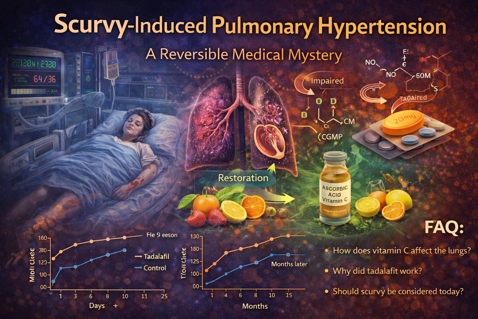 The case presented in the source article describes a young woman in cardiogenic shock, diagnosed with severe precapillary pulmonary hypertension, who experienced a dramatic clinical improvement within hours of receiving tadalafil—and complete resolution after vitamin C supplementation . The underlying cause was not genetic, autoimmune, or thrombotic. It was scurvy.