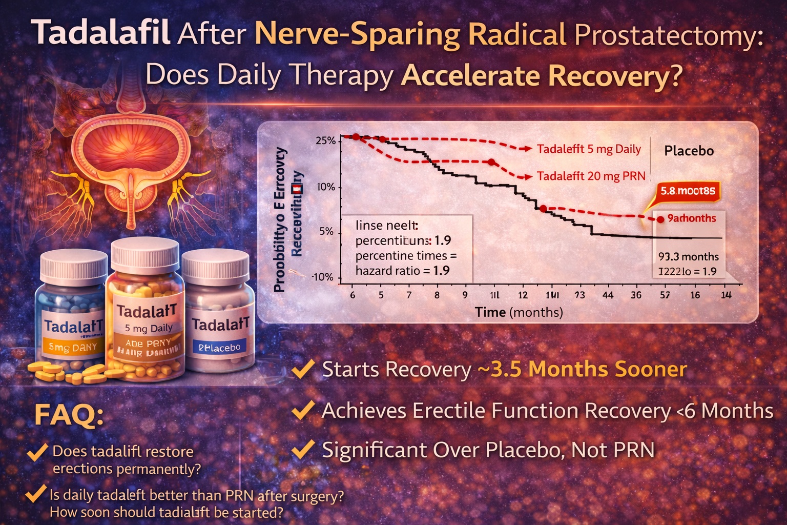 Phosphodiesterase type 5 inhibitors (PDE5 inhibitors), including tadalafil, have become central to penile rehabilitation strategies. However, one question has remained controversial: does early, continuous tadalafil therapy accelerate true recovery of erectile function, or does it merely provide temporary pharmacologic support?