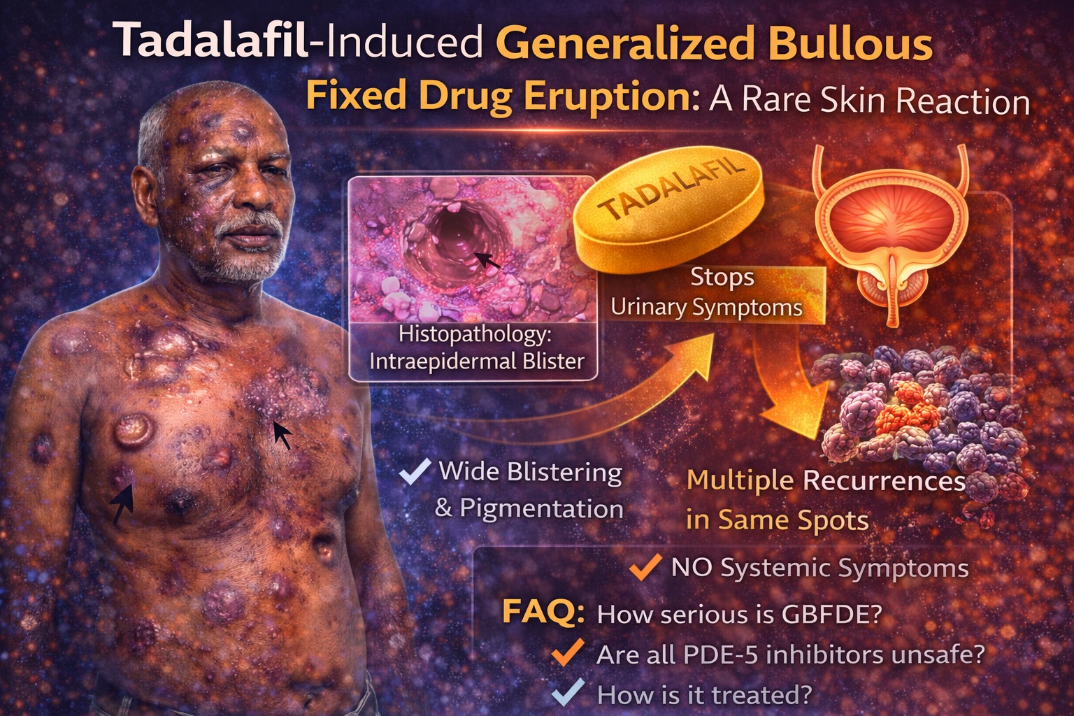 Tadalafil remains an effective and generally safe medication when used appropriately. However, this case of generalized bullous fixed drug eruption reminds us that no drug is exempt from unpredictability.