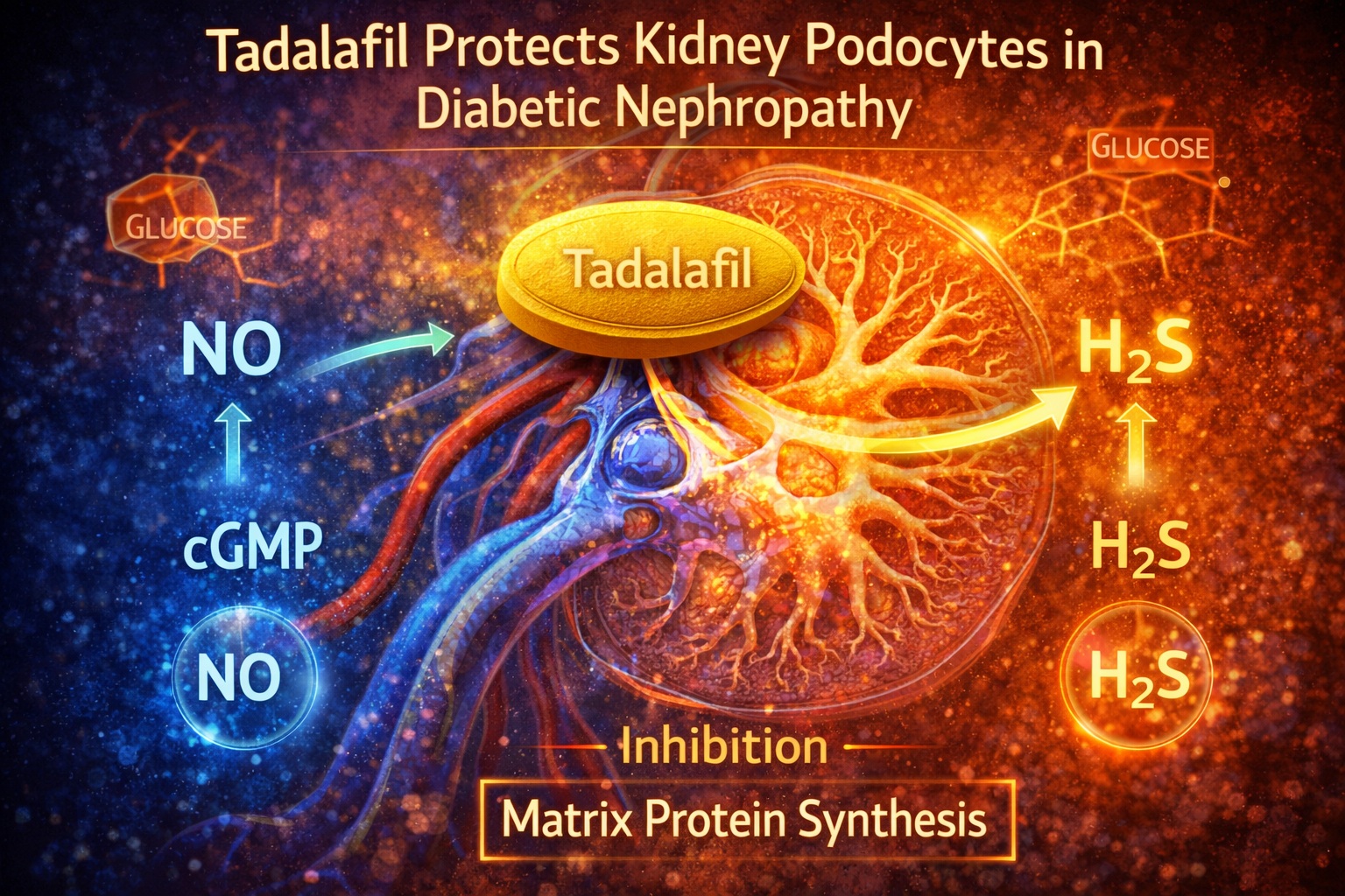 Experimental studies have demonstrated that tadalafil can inhibit high glucose–induced matrix protein synthesis in podocytes. This effect appears to involve the coordinated activity of NO and H₂S signaling pathways.