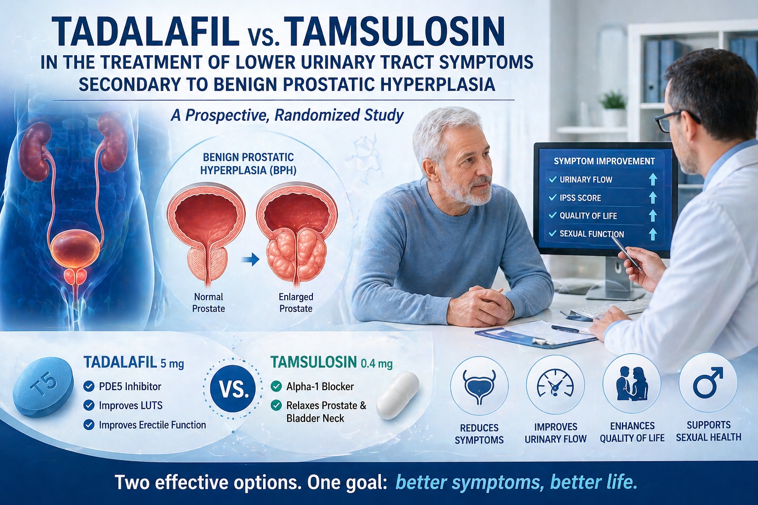 The study demonstrates that while tamsulosin may be more effective in improving objective urinary parameters, tadalafil offers meaningful benefits in sexual health and overall quality of life.