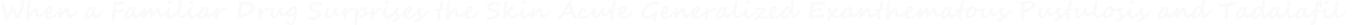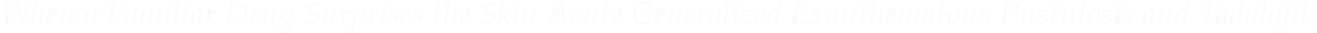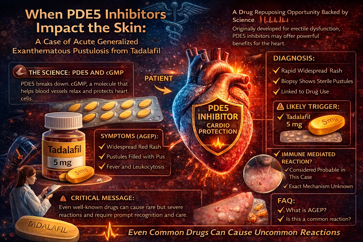 The case report presents an unusual and previously undocumented adverse reaction: acute generalized exanthematous pustulosis (AGEP) associated with tadalafil use. This finding is more than a curiosity. It challenges assumptions, expands the known safety profile of a widely used drug, and reminds clinicians that even familiar therapies can behave in unfamiliar ways.